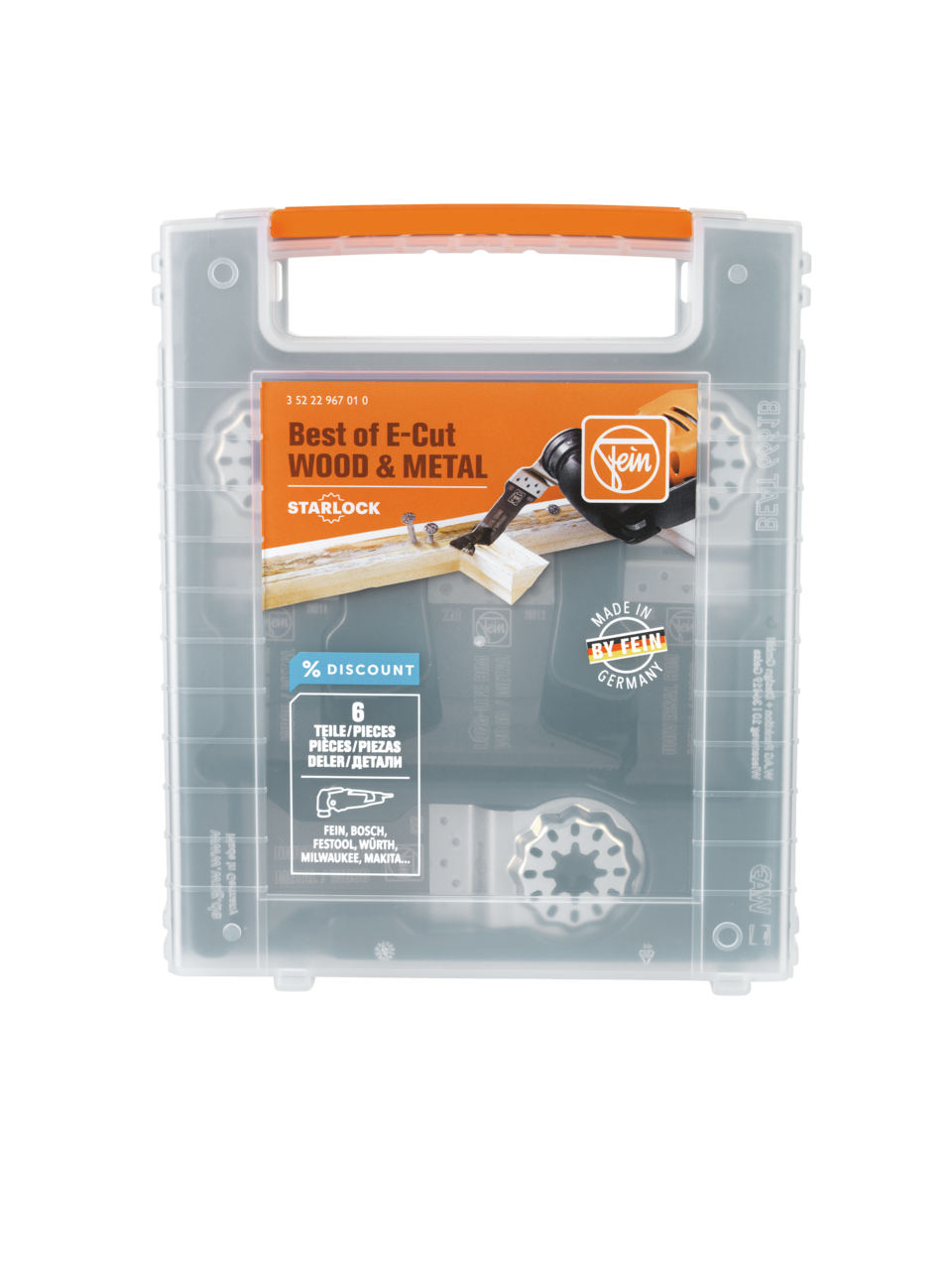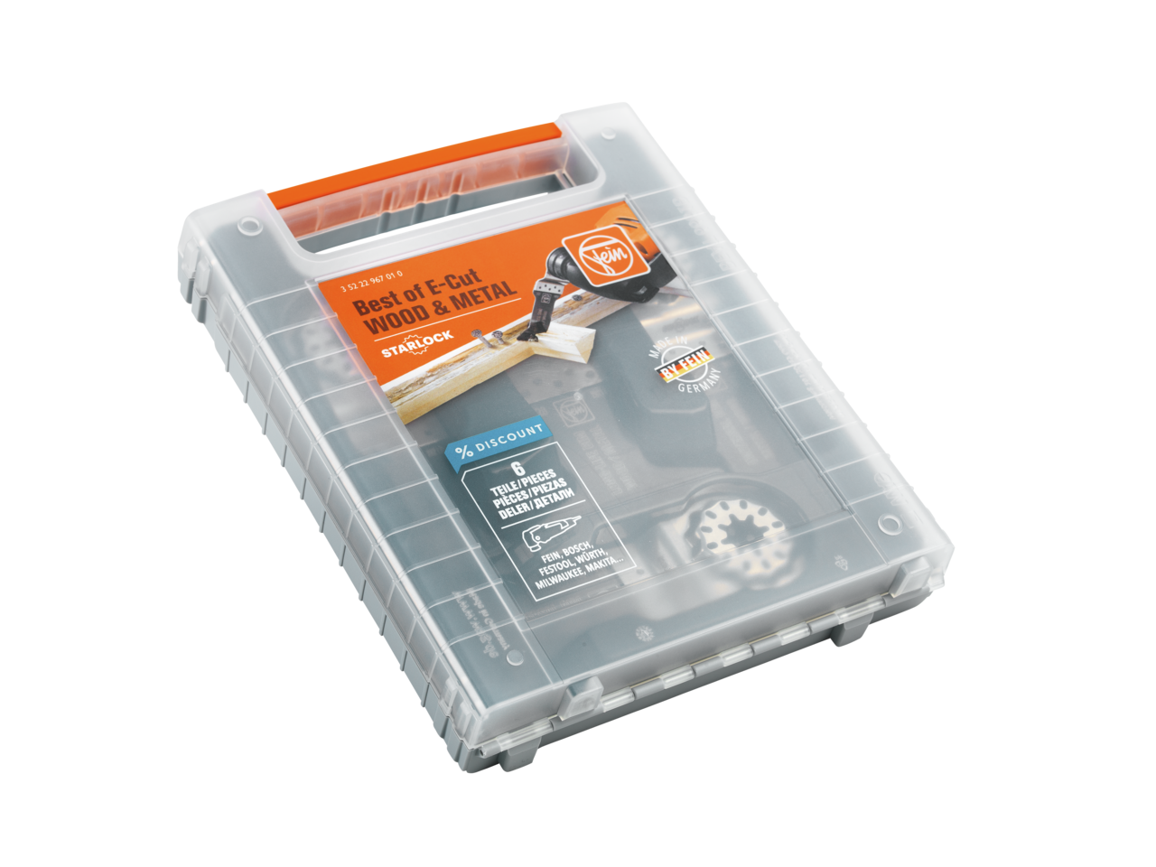 6 E-Cut daldırma testere bıçağı, ahşap ve metalde testereyle kesme işleri için. Tüm FEIN çok fonksiyonlu aletler ve piyasada yaygın olarak bulunan diğer tüm çok fonksiyonlu aletler için uygundur. Tek tek almaya göre cazip fiyat avantajlı set halinde. İçerik: 2’şer adet E-Cut Long-Life testere bıçağı (50 x 35 mm, 50 x 65 mm), 1’er adet E-Cut Universal testere bıçağı (55 x 28 mm, 55 x 44 mm).