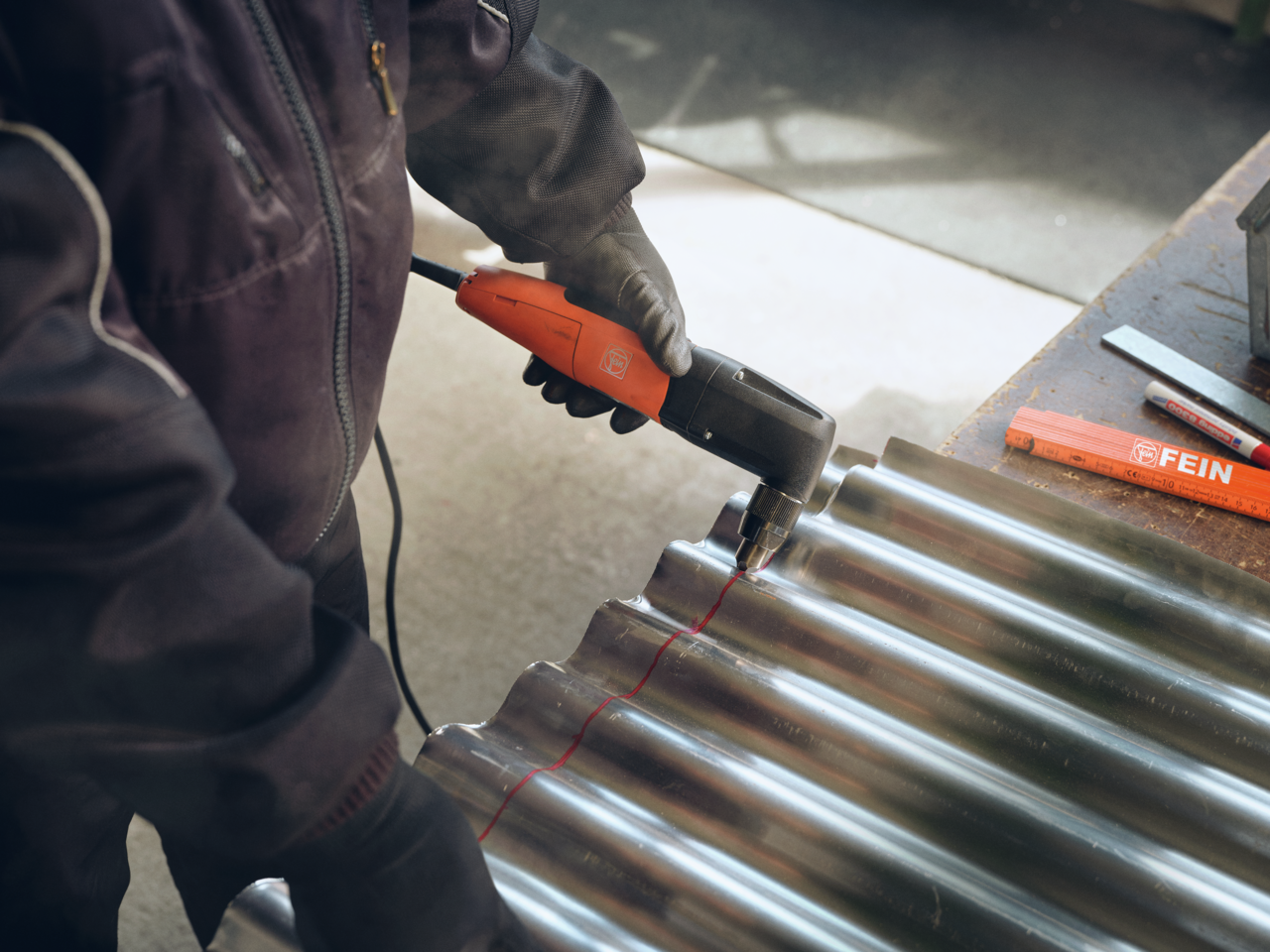 Oluklu saclar için kompakt ve hızlı sac kesici. Oluklu sac için ilave zımba ve matris seti, kalıcı keçeli kalem, maskeleme bandı ve kırma metre dahil.