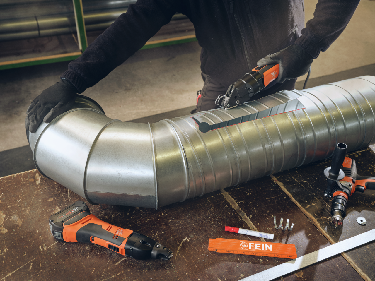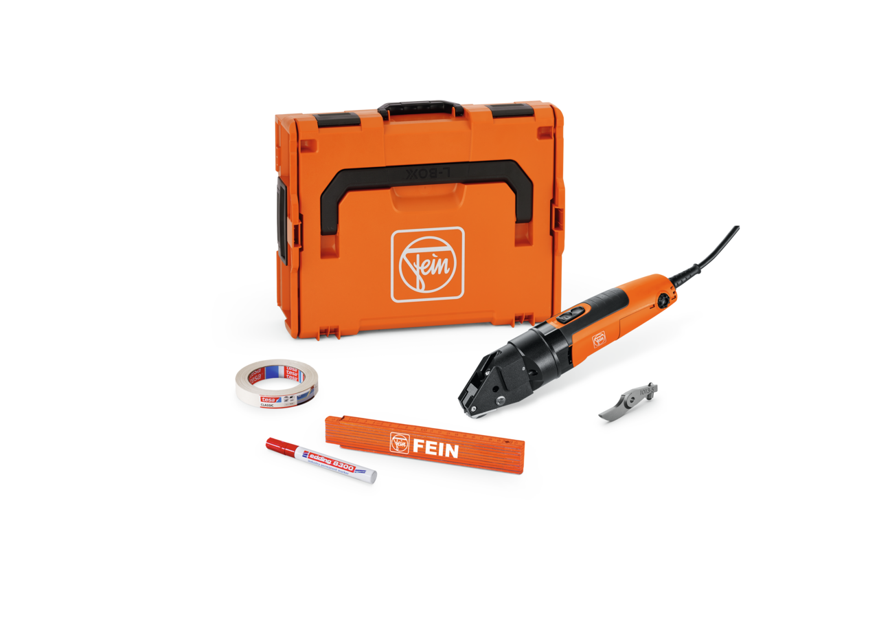 Paslanmaz çelik işleme, spiral kıvrımlı borular ve profiller ve saclar için yüksek performanslı yarık açma makası. İlave bıçak, kalıcı keçeli kalem, maskeleme bandı ve kırma metre dahil.
