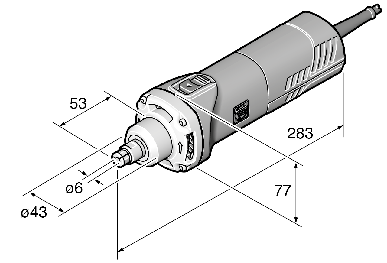 - Özellikle dar yerlerde kullanmak için kompakt konstrüksiyon, freze motoru olarak yarı sabit kullanım için (örn. kopyalama frezesi olarak) gergi boynu Ø 43 mm.